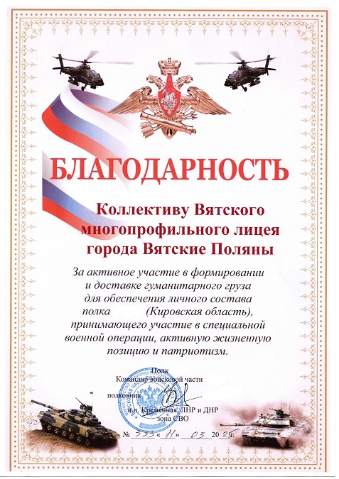 За активное участие в формировании и доставке гуманитарного груза для обеспечения личного состава полка Кировской области, принимающего участие в специальной военной операции, активную жизненную позицию и патриотизм, коллективу обучающихся, педагогов и родителей Вятского многопрофильного лицея, а также лично педагогу-организатору Вятского многопрофильного лицея, руководителю школьного музея Решетниковой Светлане Леонидовне вручена благодарность от командира войсковой части, полковника (н.н. Кременная, ЛНР, ДНР, зона СВО).